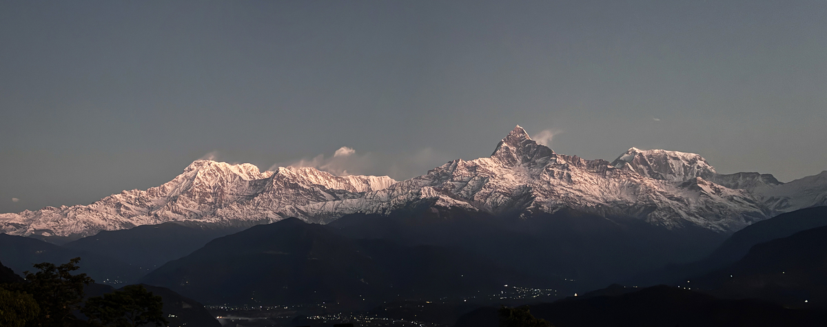 まだ日が登る前の薄明の中、尖ったマチャプチャレ峰(6993m)、アンナプルナⅠ峰(8001m)、アンナプルナサウス峰(7216m)が浮かび上がってきた。広角の写真では迫力が全く伝わらないのが残念。。眼の前にそびえ立つ山々は圧倒的な迫力だった。