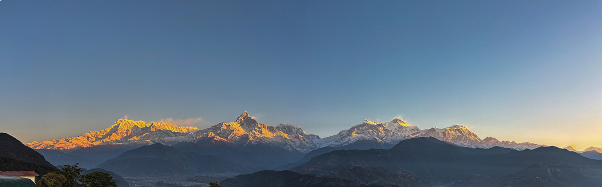 そのうち日が登り「モルゲンロート」と呼ばれる山々が赤く染まるマジックアワーが始まった。複数写真を連結してみたのだが、尖ったマチャプチャレの右側にはアンナプルナⅣ峰(7525m)とアンナプルナⅡ峰(7937m)がそびえ立っていた。