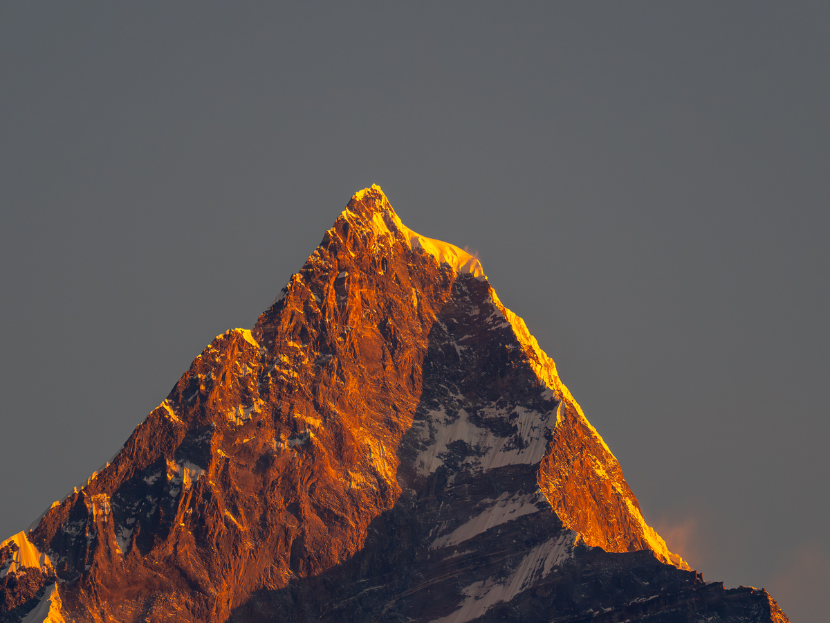 世界で最も美しい山のひとつと言われるマチャプチャレ峰の先端を超望遠レンズで撮影してみた(840mm望遠)。この山は特に神聖な山として地元住民によって崇敬されており、ネパール政府により登山が禁止されている。1957年に山頂付近まで登られたことがあるが、山頂には足が踏み入れられておらず、未踏峰となっている。「魚のしっぽ」というあだ名もある。